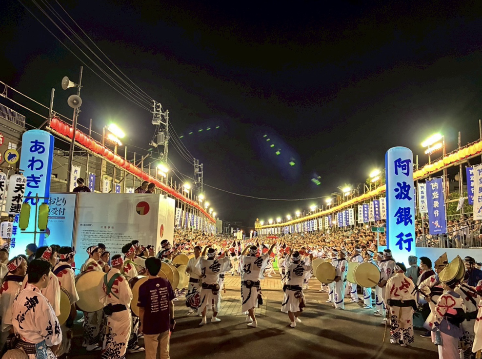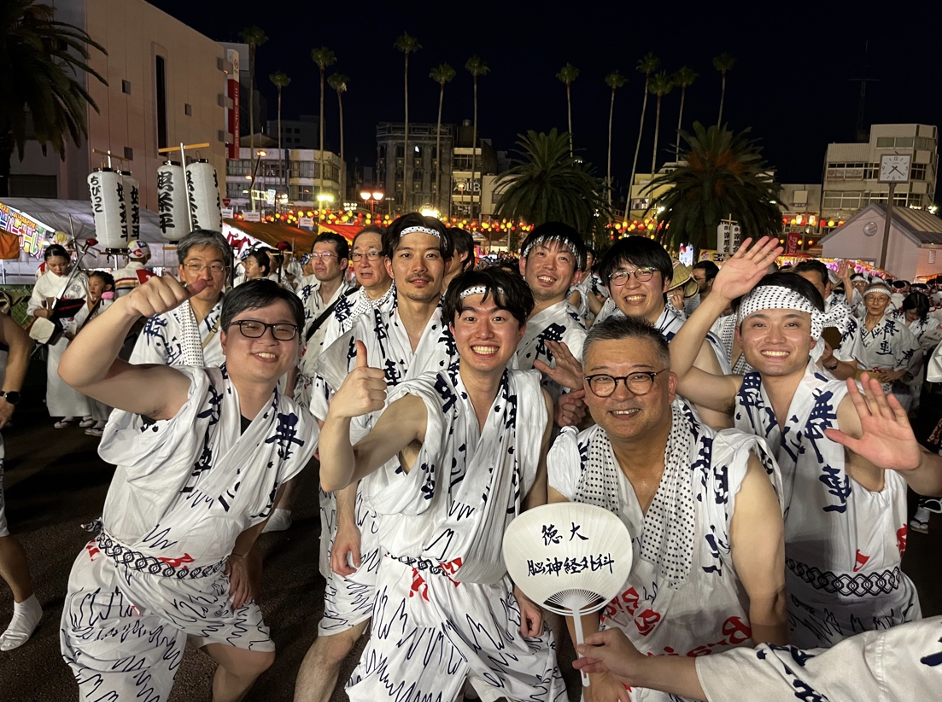 当医局からは教授ならびに新入局員を含む計7名が参加し、新人を代表して深民先生が放射線照射後の動脈瘤について発表しました。カンファレンスのみならず歴史ある「連」の皆様にご指導いただき、阿波踊りの舞台にも立たせていただきました。
