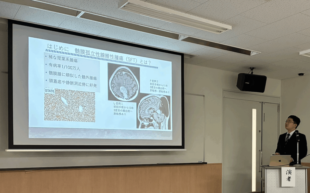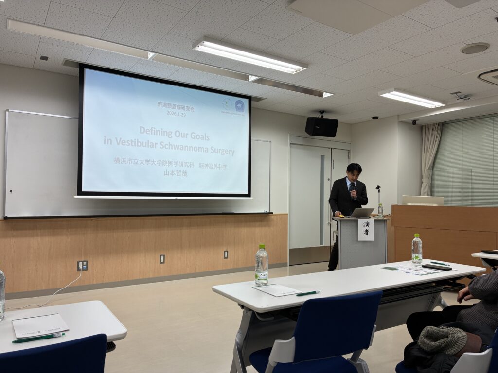 2026年1月29日(木)、4回目となりました新潟頭蓋底研究会を開催いたしました。本年は新潟大学の医療人育成センターにおいて講演形式での開催となりました。研究会としては当教室の大学院生である河辺啓太先生の研究発表である『髄膜孤立性繊維性腫瘍の遺伝子学的探検』に関しての講演で始まりました。比較的希少疾患であるSFTを対象として遺伝子変異などをターゲットとした新たな治療法に繋がる事を目指した研究であり、本年度の成果や河辺先生の熱意が伝わる内容でありました。